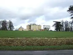 Buckland House has nine bays, the three central ones being narrow on each of its three storeys. Two wings of lower height adjoining connected by narrow galleries. The building overlooks a landscaped park,[1] which includes gardens, a cricket ground and a 150-acre (61 ha) deer park.[1][2] Buckland House is a Grade II* listed building.[1][3] Nikolaus Pevsner described it as "the most splendid Georgian house in the Country",[4] It is rumoured that a ghost of a white lady haunts the house.[5]