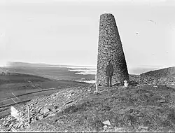 William Buckle was a boy who lived in the village of Finstown, Orkney during the late 19th century, and around the age of 13 he was employed by the local farmer at Binscarth to watch over livestock on the Hill of Heddle.[3] Watching livestock graze proved to be a tedious occupation for Buckle, and in his spare time he began constructing a stone tower, using drystone from the nearby quarry.[4] Buckle left some stones jutting out of the tower to act as steps he used to climb the tower as it got taller, eventually breaking them off once the tower was complete. Buckle's Tower in later years was used as a sightline by sailors coming into the Bay of Firth.[3]