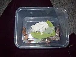 The pupae are creamy white without any apparent sclerotisation or colour pattern. The pupa is anchored inside of the last larval skin through the urogomphi. The larval exuvia, with the pupa inside, is attached underneath a piece of eucalypt bark. The entire body of the pupa is sparsely covered in a darker brown pubescence that is particularly longer and denser on pronotum. The body is segmented with eleven segments clearly visible: the three thoracic and eight abdominal segments. The body of pupa is broadly elongate with the pronotum flaring towards the mesonotum and the abdomen tapering to the terminal abdominal tergite. There are no spines anywhere on the body.