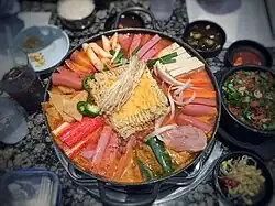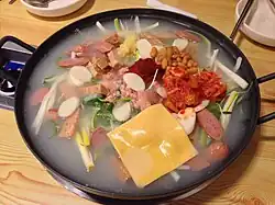 | Main ingredients | Ham, hot dogs, Spam, baked beans, kimchi, instant noodles, gochujang, American cheese |