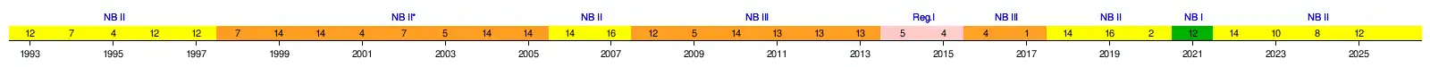 | NBII | ?. | 2022-23[26] | 38 | 12 | 11 | 15 | 39–46 | –7 | 47 | 10th | R | |||