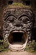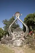 The statues are made of reinforced concrete and are ornate in design.[5] They appear to be centuries old, though they are not. There are sculptures of humans, gods, animals, and demons.[4] There are numerous sculptures of Buddha, characters of Buddhist beliefs like Avalokiteśvara, and characters from Hindu lore, including Shiva, Vishnu, and Arjuna.[2] The sculptures were presumably cast by unskilled workers under the supervision of Sulilat.[2] One notable sculpture resembles a giant pumpkin.[1] It has three stories, representing three levels of existence: hell, Earth, and heaven.[1] Visitors can enter through an opening, which is the mouth of a 3-metre-tall demon head (9.8 ft), and climb several staircases from hell to heaven;[4] each story contains sculptures depicting the respective level. At the top, there is a vantage point, from which the entire park is visible.[4] Another sculpture, an enormous 40-metre-long (130 ft) reclining Buddha, forms the centerpiece attraction of the park.[6]