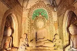 During this period, the western mainland remained divided between four main regional political-ethnic zones. In the Shan Realm, the Shan people established a loose confederation of valley kingdoms. The Shan kingdoms supported Theravada Buddhism in imitation of the Burmese elites, though the Buddhist institutions in the Shan realm never wielded political power as they did in the Burmese regions.[58] In the 14th century, the Buddhist sangha continued to receive patronage from regional Shan kings like Thihathu and scholarly activities continued under their reigns.[59] Meanwhile, Arakan was ruled by the kingdom of Mrauk-u, who also patronized Theravada Buddhism.