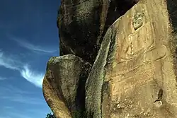 It was truly a holy place marked by a colossal rock image of Buddha, measuring 700 x 500 cm. While the asana is the Buddha is 120 x 390 cm. The rock reveals a colossal figure of Buddharupa in deep contemplation on a high asana. The Buddha is fully robed in drapery; the graceful clinging folds of which are visible on his seat.
