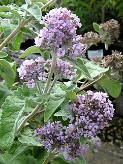 The 'original' B. crispa as known to horticulture, cloned from a plant grown at Aldenham, England (see Cultivation), is a comparatively slow growing deciduous shrub of bushy habit, reaching 3.5 m high, more in spread.[7] Young twigs and both sides of the leaves are covered with a white or tawny loose felt. The leaves are ovate-lanceolate, 5–12 cm long by 2.0–4.5 cm wide, with petioles 0,6–2,5 cm. The shrub flowers from February to August.[8] The fragrant flowers form terminal panicles 7–10 cm long by 5 cm wide. The corolla is lilac, with an orange throat.[9] Ploidy 2n = 38 (diploid).[10]
