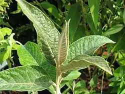 Buddleja megalocephala is a dioecious tree 5 – 15 m high with a trunk < 65 cm in diameter at the base, with brown fissured bark. The young branches are thick, quadrangular and densely tomentose, bearing lanceolate or elliptic-oblong leaves 7 – 20 cm long by 2 – 6 cm wide on 1 – 2 cm petioles, subcoriaceous, glabrescent above, tomentose below. The inflorescence measures 6 – 20 cm by 8 – 10 cm, comprising globose heads in racemes, occasionally with two orders of branches; the heads 1.2 – 2 cm in diameter, each with 40 – 50 orange flowers; the corollas 4 – 5 mm long. Ploidy: 2n = 76.[1]