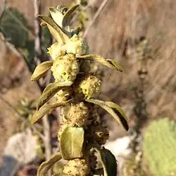 Buddleja perfoliata is a small dioecious shrub 0.8 – 2 m tall in the wild, much branched, and with a greyish-black shredding bark. The young branches are subquadrangular and tomentose, bearing sessile lanceolate to elliptic opposite subcoriaceous leaves, rugose above with dense felt-like tomentum covering both surfaces. The yellow inflorescences, redolent of sage, are 5 – 25 cm long, comprising 5 – 26 pairs of heads borne in the axils of the leaves, each head about 1 cm in diameter with 30 – 40 flowers. Ploidy: 2n = 38.[2]