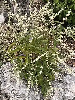 Buddleja racemosa, commonly known as the Wand (or Texas) Butterfly Bush, is endemic to the southern edge of the limestone Edwards Plateau in Texas, United States, from Austin to Rocksprings, growing around streams, creeks and springs at elevations of 250 – 750 m. The plant was first named and described by John Torrey in 1859.[1][2]