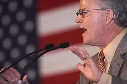 On March 3, 2011, Roemer announced the formation of an exploratory committee to prepare for a possible run for the 2012 presidential nomination of the Republican Party.[51] Roemer stressed that campaign finance reform would be a key issue in his campaign.[52] Pledging to limit campaign contributions to $100 (~$140.00 in 2024) per individual, Roemer appeared as one of five candidates at a 2011 March forum in Iowa sponsored by the Faith and Freedom Coalition.[53] But he was not invited to any of the Republican debates because he failed to meet the 7 percent minimum criterion for popularity in polls.[54] He was not even included as an option in several polls[55] until the 2012 Iowa Caucus and the 2012 New Hampshire primary in early January.[56] Instead Roemer attempted to reach audiences through social media, including tweeting responses to debates in which he could not participate. His donations averaged $30,000 a month, far below what is raised by the front runners.[57] This difference in campaign fundraising may be attributed to the fact that Roemer limited donations to $100 (~$140.00 in 2024) per U.S. citizen, and denied all PAC, Super PAC, and corporate donations.[58] His campaign garnered some visibility when Roemer starred in an advertisement for Stephen Colbert's Super PAC, in November 2011. The ad lampooned the flimsiness of legal restrictions against Super PACs coordinating with the candidates they support.[59]