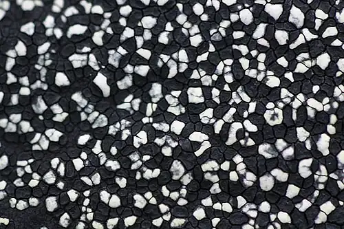 This lichen experiences high fluxes of photosynthetically active radiation, desiccation, and cold temperatures.[9] The Net Assimilation Rate (NAR) measures how organisms convert light and carbon dioxide into organic substances through photosynthesis, minus respiration. Buellia frigida's maximum NAR occurs at 10 °C (50 °F) with full thallus hydratation, showing its photosynthetic efficiency in polar ecosystems.[20] Buellia frigida tolerates the harsh conditions of Antarctica. Its dark colouration is the result of pigmentation that protects it from harmful ultraviolet radiation, which is even greater at high latitudes and altitudes.[18] Hydration swells the lichen thallus, which reduces the density of its black pigmentation in the cortex. This exposes the algal layer to light, enabling photosynthesis. When dry, the thallus shrinks, increasing the density of its pigmentation and shielding itself from light; this effect is most prevalent in the marginal areas, which contain the most algae.[8] In situ measurements of this lichen's photosynthetic activity were conducted in continental Antarctica, showing it thrives in its habitat. Its high photosynthetic rate indicates adaptation to Antarctica's extreme conditions like low temperatures and intense light. This adaptability enables its survival in this region, where it is exposed to fluctuating moisture levels due to drying cycles of meltwater-soaked thalli.[21] The photobiont partner of Buellia frigida has a higher cold resistance potential and a longer retention of photosynthetic capacity during exposure to freezing temperatures than the counterpart photobiont of several other Antarctic and European lichens.[22]