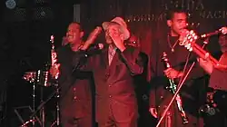 Many of the Cuban musicians who featured on the album were at their musical prime in the 1940s and 1950s. After the success of the 1997 record they became known in Cuba as "Los Superabuelos" (the Super-Grandfathers).[23] Juan de Marcos González, a Cuban folk revivalist who was younger than the bulk of performers introduced Cooder to veteran singer Ibrahim Ferrer. Ferrer (1927–2005) had been lead vocalist for bandleader Pacho Alonso, and also sang for Beny Moré, Cuba's most prominent performer in the 1940s, before his soft singing style fell out of fashion.[24] Having found the semi-retired seventy-year-old Ferrer taking his daily stroll on the streets of Havana and shining shoes for extra money, González signed him up for the project. Cooder later described the discovery as something that happens "perhaps once in your life", and Ferrer as "the Cuban Nat King Cole".[25] Ferrer became a prominent member of the group, and the success of the record was attributed in part to the popularity of his vocal performances.[25] The singer went on to record a number of successful solo albums and performed with contemporary acts such as the Gorillaz before his death in 2005 at the age of 78.[26]