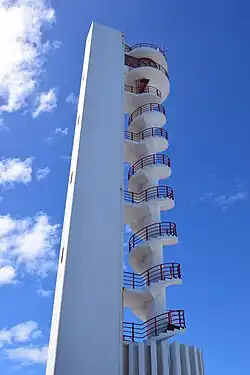 Considered to be a "remarkable design", it consists of two concrete towers rising from a single base, the rearward one is square, with the seaward facing tower having a spiral staircase that is open to the elements. This stairwell leads to the top of the tower with an enclosed lantern room and galleries, at a height of 40.5m.[1][5] With a focal height of 77 m above sea level, the light can be seen for 20 nautical miles. Its light characteristic is made up of a pattern of four flashes of white light every eleven seconds.[1][6]