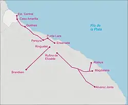 - ^ Although Ensenada was the main terminus of the line, the BA&E later acquired several railway lines with their own terminus (such as Brandsen, Magdalena and Álvarez Jonte in Punta Indio Partido).