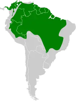The range southeastwards in Brazil covers the entire central-southern and southeast Amazon Basin. From here the range extends almost to the southeastern Atlantic coast of Brazil, but is mainly in the southern Cerrado, and possibly into the adjacent northeastern Pantanal.[4]