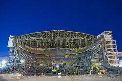 Buffalo Memorial Auditorium (the "Aud") under demolition. The Buffalo Skyway Bridge crosses the Buffalo River to the right of the shot. The building's basement was dug through the remains of the junction of the Erie Canal and Main-Hamburg Canals in downtown Buffalo.