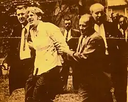 During the Vietnam War there was a rise in draft resistance as a political statement. A group of students, primarily associated with the University at Buffalo, had been active against the draft and the war.[1][2][3][4] When they and supporters sought sanctuary in the Unitarian church on Elmwood Avenue, U.S. Marshals, FBI agents, and Buffalo Police surrounded the church. The minister, Dr. Paul Carnes, was out of the country in Romania during this time. Eventually, the lawmen "stormed" the church.[5] When the group of lawmen entered the church, they used blackjacks to "clear the aisle". Bruce Beyer, a leader of the Buffalo Draft Resistance Union, was arrested, as were seven others, on charges including draft evasion and assaulting an officer. Others arrested included prominent campus radicals Carl Kronberg and Jerry Gross. A later investigation led them to arrest Students for a Democratic Society organizer Bill Yates.[6][1][2][7][8]