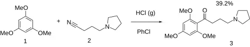 Acylation between 1,3,5-trimethoxybenzene [621-23-8] (1) and 4-pyrrolidinobutyronitrile [35543-25-0] (2) occurs in chlorobenzene solvent in the presence of gaseous hydrochloric acid to give Bufomedil (3). This is a demonstration of the Hoesch reaction.