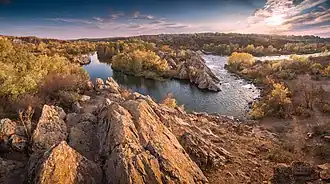 The Bug Gard National Nature Park (Ukrainian: Національний природний парк «Бузький Гард», romanized: 'Buz'kyi Hard') covers an area along the Southern Bug River in south-central Ukraine. At this point, the Southern Bug River cuts through the southern edge of the Ukrainian Shield (a block of Archean basement rock). The national park is therefore a canyon that transitions the river from the upland plateau to the steppe region.[1] The word 'gard' in the name refers to a type of fishing structure used in the Cossack era.[2] The park is spread in sections over Voznesensk and Pervomaisk districts of Mykolaiv Oblast. The major portions are about 140 km upstream from the estuary of the Southern Bug at the Black Sea.