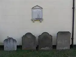There are ten gravestones and monuments in the small burial ground to the east of the chapel. The first is a 40 by 29 inches (102 cm × 74 cm) headstone and accompanying footstone, neither with any inscription. Next is a 38 by 28 inches (97 cm × 71 cm) headstone commemorating Mary Gillam (d. 1867) and her husband James (d. 1870). The Swann family—George (d. 1849), Charlotte (d. 1874) and Charlotte junior (d. 1884)—are listed on the next headstone, which measures 44 by 24 inches (112 cm × 61 cm) and which has a footstone bearing their initials. The next measures 44 by 30+1⁄2 inches (112 cm × 77 cm) and names Ann Snashall (née Inglefield; d. 1858), two infant children and her father James Inglefield (d. 1864). Smaller and partly illegible, the next gravestone (23+1⁄2 by 19 inches (60 cm × 48 cm)) commemorates Elizabeth Sloper (d. 1846?). Thomas Ellis (d. 1798) is named on a 45 by 30 inches (114 cm × 76 cm) headstone, next to which is another measuring 54 by 30 inches (137 cm × 76 cm) headstone which commemorates members of the Humphrey family: Mary (d. 1852) and John (d. 1866), five children who died between 1820 and 1854, and a grandchild (d. 1872). On the next headstone, William Bugby himself (d. 1792?) is commemorated alongside his wife Mary (d. 1787). The same Thomas Ellis (d. 1798) appears again on a pedimented monument of white marble which was taken from the chapel and placed against the east wall; it measures 38 by 26+1⁄4 inches (97 cm × 67 cm). Next to this stands a 53 by 30 inches (135 cm × 76 cm) headstone which names Joseph Weller (d. 1864), his wife Maria (d. 1859) and their son Joseph junior (d. 1851); this also has a footstone with their initials.[6][17]