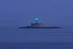 The Bugio Lighthouse with its characteristic green light. To the left can be made out the red light of the São Julião lighthouse. Together, these lights mark the entrance to the port of Lisbon.