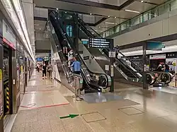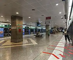 The station is wheelchair-accessible. A tactile system, consisting of tiles with rounded or elongated raised studs,[44] guides visually impaired commuters through the station, with dedicated routes that connect the station entrances to the platforms or between the lines. Wider fare gates allow easier access for wheelchair users into the station.[45]