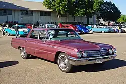 The 1962 Buick LeSabre was only moderately changed from the previous year with bodies taking on a few extra inches to give them a longer look along with new grilles and taillights. Two-door hardtop coupes received a new convertible-like roofline complete with simulated bows. Under the hood, the 364 cubic-inch V8 was replaced by the larger 401 cubic-inch V8 used in Invictas and Electra 225s. LeSabres came standard with a two-barrel high-compression (10.25 to 1) version rated at 280 horsepower with a low-compression regular fuel version of that same engine rated at 265 horsepower offered as a no-cost option. Optional at extra cost was the four-barrel 325-horsepower 401 which was standard on the Invicta, Electra 225 and the mid-year Invicta-based Wildcat coupe. Inside, interiors were mildly revised with the "Mirrormatic" speedometer replaced by a conventional horizontal sweep unit.[2]