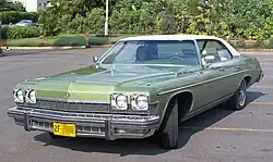 The upscale LeSabre Luxus designation was dropped and replaced by the LeSabre Custom nameplate. 1975 also was the first year of the catalytic converter, and standard high energy ignition which was part of GM's Maximum Mileage System at the time Introduced in September 1974. The 1975 LeSabre was the first to require use of unleaded gasoline, due to the advent of the catalytic converter. The LeSabre lineup offered a coupe and two sedans while the LeSabre Custom lineup offered the coupe, two sedans, and the only convertible in the Buick lineup. 1975 would be the final year for the LeSabre Custom Convertible with around 5,300 examples rolling off the assembly lines. Engine offerings were reduced to just two: the standard 5.7-litre V8 (350 CID) and a four-barrel carburetor or optional 7.5-litre V8 (455 CID) with a four barrel. The 1975 Buick LeSabre now featured a larger, cross-hatched patterned grille which still ran the entire front of the car, dual headlights were once again set side by side instead of individually. Turn signals were located within the front bumper. A Buick tri-shield hood ornament was standard on the Custom Series and optional on the base series. The three-hole 'ventiports' were moved from the hood to the front fenders. Slightly larger but narrower taillamps draped the back of the car with back-up lights positioned in the center broken up by the license plate. Four-door pillared sedans received a new small third windows to emulate the six-window "Colonnade" styling of GM intermediates while four-door hardtop sedans had new opera windows. Inside, a new flat instrument panel shared with Electra and Riviera replaced the wrap-around cockpit dash of previous years and featured a horizontal sweep speedometer that read to only 100 mph compared to 120 mph in previous years and also included kilometer readings. Otherwise, interior trimmings received only minor revisions. Convertible production for both the LeSabre Custom and the Centurion convertibles were not very abundant in the years 1971 to 1975. The rarest production in that time was the 1971 LeSabre Custom with just over 1,800 units built, and the most produced was the 1973 Centurion with slightly over 5,700 units built. Due to this very low production volume and the end of the full-size convertible era, this may make this series of ragtop LeSabre Custom and Centurion Convertibles quite collectable - depending on the vehicles' overall condition. The convertible mechanism used was called the 'scissor top' that folded inward on itself, instead of straight back. This was featured on all GM full-size convertibles from 1971 to 1976.[2]