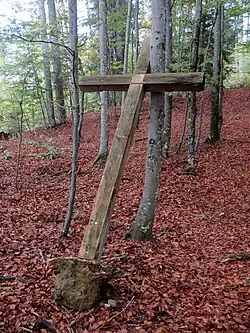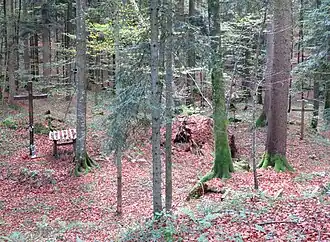 Bukovec is the site of three known mass graves associated with the Second World War. The Mačkovec Mass Grave (Slovene: Grobišče Mačkovec) is located in the woods southeast of the settlement. Its location is marked by crosses cut into the trunks of two trees. It contained the remains of about 40 prisoners of war, mostly members of the Anti-Communist Volunteer Militia, that were taken from the prison in Ribnica and murdered at the site on 27 or 28 October 1943 by the Partisan Loka Brigade.[6][7][8] In October 2013 the remains were disinterred and reburied at the cemetery in Begunje pri Cerknici.[9][10] The Italian Soldiers Mass Grave (Grobišče italijanskih vojakov) is located in the woods south of Bukovec, below the north slope of Mačkovec Hill. It contains the remains of Italian soldiers.[8][11] The Romani Mass Grave (Grobišče Romov) is located in the woods south of Bukovec near the Janez Klančar Grave in the territory of neighboring Selo pri Robu, which is marked with a cross. It contains the remains of Romani murdered at the site[8][12] by a Partisan group led by Stane Semič.[13]