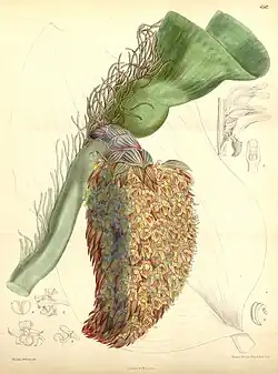 The thick rhizome, reportedly up to 20 cm in diameter (but the thickest reliably reported has been 5 cm) snakes its way around tree trunks climbing up into the light. Exact length figures are not available, but its discoverer, Odoardo Beccari, reported that it climbed "to a great height".[2] Along its length at intervals are the relatively small egg shaped pseudobulbs each with a huge thick, leathery leaf at their apex. They are up to 60 cm long and 20 cm wide, yellowish-green and point vertically. The huge bowl shaped leaves are designed to catch falling debris and turn it into fertilizers.[3] The inflorescence is produced from the rhizome near one of the pseudobulbs and hangs downwards to about 20–22 cm and is composed of hundreds of small yellowish flowers netted with red that smell like rotting meat to attract various flies.[1][4] It grows in the rainforests of Borneo.[4]