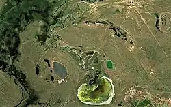 The Buldyrty begins at the confluence of two small rivers, the Bylkyldagan and Zhosaly, close to Aksuat village. It heads in a southwestward direction across Shyngyrlau District, forming meanders within a floodplain. Shortly after Karasu village it bends southwards for a stretch until its mouth in the northern shore of lake Zhaltyrkol, located among other salt lakes. The Buldyrty river flows roughly parallel to the Olenti to the northwest and the Kaldygaity to the southeast.[3][4]