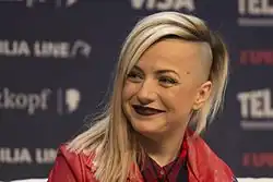 The Bulgarian performance featured Poli Genova performing a choreographed routine in a black, white and nude outfit with LED enhancements that light up during the final chorus of the song.[25][26][27] The stage colours were black and white and the LED screens displayed black and white elements, television static and rows of dancers performing the same choreography as Genova. Five backing vocalists joined Poli Genova on stage at the end of the song: Borislav Borisov Dimitrov (Bobo), Cesár Ken Charleston (Cesár Sa) and the members of the group LaTiDa, Desislava Hristova, Elizabet Nesheva and Yana Baleva.[28] Sampson would go on to represent Austria in the Eurovision Song Contest 2018. The stage concept for the Bulgarian performance was developed by Swedish choreographer Ambra Succi, who completed the choreography of performance together with Bulgarian choreographer Milen Dankov.