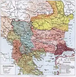 A defensive alliance between Bulgaria and Turkey had been concluded on 19 August 1914, but negotiations for Bulgaria's intervention in the war did not begin between the two parties until May 1915. It quickly became clear that Bulgaria sought a rectification of the border, and Germany and Austria-Hungary put pressure on their Ottoman ally to accept.[1] The Austro-Hungarians for their part were convinced that a Turco-Bulgarian alliance would keep Greece and Romania neutral. The German ambassador to Turkey, Hans von Wangenheim, was unconvinced by the proposed alliance, believing that Romanian neutrality could only be secured by Austro-Hungarian territorial concessions. The Austro-Hungarian ambassador, Johann von Pallavicini, convinced the Ottomans to accept a border rectification, but Bulgaria initially refused to consider abandoning their neutrality—the only condition on which the Ottomans would yield territory.[2]