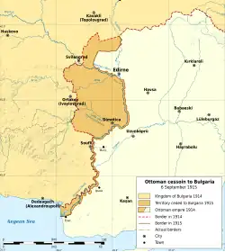 On 6 August 1915, the British launched an offensive on Gallipoli that exposed Turkey's grave shortage of munitions. On 17 August, the Turkish minister of war, Enver Pasha, wrote to the German chief of staff, Erich von Falkenhayn, to see if an Austro-German offensive against Serbia was forthcoming. When told that it hinged on Bulgaria's intervention, which in turn hinged on a Turco-Bulgarian pact, the Ottomans reached a quick agreement with Bulgaria on 22 August.[2] They ceded the Maritsa river and its left bank to a depth of 1.5 kilometres.[3] This gave Bulgaria control of the railway to the Aegean port of Dedeagach.[4] It also left Edirne (Adrianople) vulnerable to Bulgarian attack, but signature of the accord was dependent on a military convention being signed between Bulgaria, Austria-Hungary and Germany.[2]