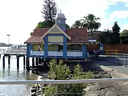 The Bulimba ferry wharf is a small picturesque structure on the bank of the Brisbane River at the end of Oxford Street, Bulimba. It is approached from the riverside by a pontoon and from the landward side by a pathway and entrance leading into a covered waiting area.[4]