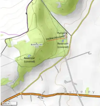 The Staffordshire Potteries Water Board was granted permission in 1937 to build drinking water pumping stations at Peckforton and Tower Wood in Cheshire with a reservoir on Bulkeley Hill, from where the water was piped to a large reservoir at Cooper's Green near Audley for distribution to Tunstall and the Potteries. After the water was pumped into the elevated reservoir, it ran in a 27-inch pipeline (ø 686 mm) to the potteries.[3][4]
