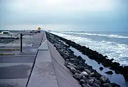 Seawall on North Padre Island constructed in the backbeach to protect condominiums from storm waves and beach erosion. Central Texas -