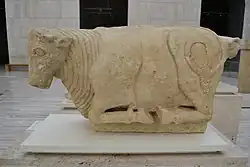 The Bull of Osuna is a limestone high relief Iberian sculpture, 82 cm high, dated from the end of the 5th century BCE, that is on display at the National Archaeological Museum of Spain in Madrid. It was found in the archeological site of the ancient Iberian city of Urso (Osuna) in Seville, Spain. The bull is ashlar and was carved, (probably in a Turdetani workshop), as a funeral monument. It is believed to have had some protective function.