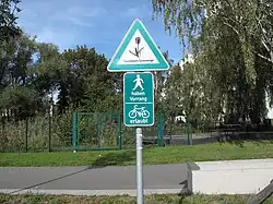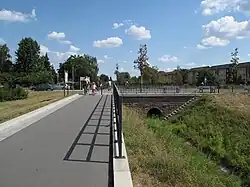 The Bullengrabenweg, which runs alongside the moat and the green corridor, is one of Berlin's 20 main green routes, most of which are marked with blue and white stickers with the corresponding number. There are still some gaps in the network, for which alternative and bypass routes are provided.[45][46]