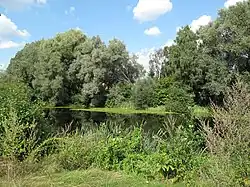 The faunal research team, who conducted investigations in 1988/1989, categorized the highly urbanized region as having no significant impact on the population of most animal species.[29] Notable occurrences were found among the birds with the marsh warbler, which prefers damp high herbaceous vegetation and is listed in the Berlin Red List in the early warning stage of declining populations. There was also evidence of the reed warbler and reed bunting, which are dependent on reed beds, and of the pouch tit, which finds its preferred combination of different siltation communities in the lowlands. At the meadow basin biotope, common moorhen and coots were found alongside the little grebe, which is on the early warning list.[30] The grass frog, which is no longer on the current Berlin Red List due to a continuous good population development since 1991, was also observed by the working group at the meadow basin.[31] From the class of amphibians, the pond newt was also detected at all small water bodies. The meadow basin also formed a spawning area for the strictly nocturnal spadefoot toad, which the German Society for Herpetology and Terrarial Science named amphibian of the Year in 2007 due to its severe endangerment. Another frog, the European green toad, which is strictly protected under the Habitats Directive, used the bottom of the watercourse to lay its spawning lines.