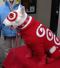 Bullseye is a fictional Bull Terrier and the official mascot of Target Corporation. The dog is featured in Target's commercial campaigns and in-store signage, and is used in various marketing campaigns. Despite being presented as a male character, Bullseye is portrayed by female dogs.[1]