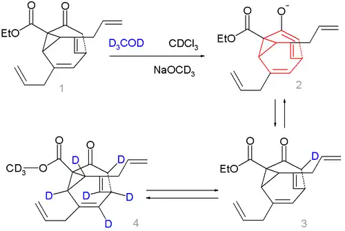 Compound 1 in scheme 2 is not a fluxional molecule but by adding base (sodium methoxide in methanol) the ketone converts to the enolate 2 and the fluxional state is switched on. Deuterium labeling is possible forming first 3 a then a complex mixture with up to 7 deuterium atoms, compound 4 being just one of them.