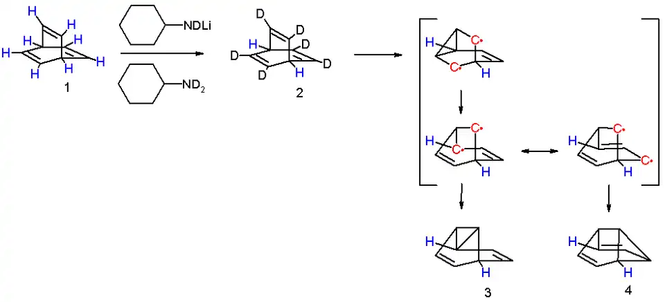 One insight into the reaction mechanism for this photoreaction is given by an isotope scrambling experiment.[8] The 6 vinylic protons in barrelene 1 are more acidic than the two bridgehead protons and therefore they can be replaced by deuterium with N-deuteriocyclohexylamide. Photolysis of 2 results in the initial formation of a biradical intermediate with a cyclopropane ring formed. This product rearranges to a second intermediate with a more favorable allylic radical as two mesomers. Intersystem crossing and radical recombination results in equal quantities of semibullvalenes 3 and 4. The new proton distribution with allylic, vinylic and cyclopropanyl protons determined with proton NMR confirms this model. As noted, the conversion of barrelene to semibullvalene is a di-π-methane rearrangement.
