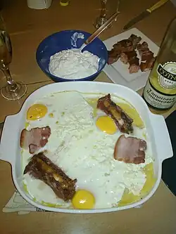 Bulz,[1] also called urs de mămăligă, is a Romanian dish prepared by roasting polenta (mămăligă) and cheese in an oven. Bulz is often eaten with sour cream.