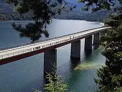 The road begins in Vorderriß,[1] where the continuation leads into the Austrian village of Hinterriß. It runs to the east along the river Isar and crosses the Sylvenstein Dam. Further to the east, the road is briefly interrupted by Austrian territory. From here, the road runs northward over the Achen Pass, passes through Kreuth and reaches Lake Tegernsee which it follows along the east coast. The first segment ends in Gmund at the Bundesstraße 318.