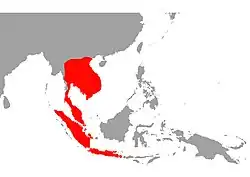 It is found in Southeast Asia from Indochina south to Java and Bali in Indonesia.