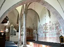 The most distinguishing feature of the interior is no doubt the richly painted walls, with murals executed by a master painter probably from Prussia or Bohemia.[1] These are from the late 14th century or early 15th and depict different Christian themes, like the Last Judgement, the crucifixion, a few of the apostles but also the Mass of Saint Gregory and legends of saints.[1][2][3] As for the previously mentioned depicted knights, scholars have different views of what they may depict or represent. One theory is that they are Teutonic knights.[1] Another claims that they represent a depiction of the Battle of Visby,[5] while others believe they are, in line with the other paintings, representing the Christian theme of the martyrdom of the Theban Legion.[2][3] A single remaining stained glass window remains, a baptismal font from the 13th century and an oddity: a mite box in stone, which is signed by the stonemason in runes, Lafrans made this stone.[2][3]
