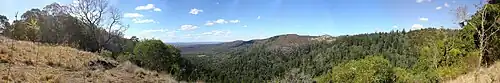 The Bunya Mountains are a distinctive set of peaks forming an isolated section of the Great Dividing Range in southern Queensland. The mountain range forms the northern edge of the Darling Downs in the locality also called Bunya Mountains near Bell and Dalby. The mountains are south of Kingaroy and just to the south west of Nanango. The range is the remains of a shield volcano which was built from numerous basalt lava flows about 23–24 million years ago.[1]