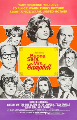 Buona Sera, Mrs. Campbell is a 1968 American comedy film starring Gina Lollobrigida, Shelley Winters, Phil Silvers, Peter Lawford and Telly Savalas. It was produced and directed by Melvin Frank, who co-wrote the original screenplay with Denis Norden and Sheldon Keller.