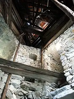 The interior of the keep only has a triangular floor plan in the lower section. A section of wall in the western corner at a height of 1.8 to 2 meters above the ground creates an irregular pentagonal shape. The walls have a length of around 5.1 meters in the east, 0.9 meters in the north-east, around 3.8 meters in the north-west, around 1.2 meters in the west and around 3.9 meters in the south-west at a height of around 2 meters on the inside. Light enters the interior of the keep through two vertical light slits in the lower part of the north-west and south-west walls. The light slit in the south-west wall was added during the renovation work carried out in the 1980s, as the wall in this area was in a poor state of repair. The light slits are around 50 centimetres wide on the inside and taper to a width of 10 to 20 centimetres on the outside. Remains of plaster have been preserved in the lower part of the east wall. In the original masonry there are several square holes measuring around 10 to 20 centimetres, which presumably supported the beams of the false ceilings. In the northern and western corners of the keep, there are several niches around 50 centimetres high, 60 centimetres wide and between 60 and 85 centimetres deep, which are also lined with stone slabs in the western corner. On the second floor, there are two steps on the north-west wall that lead to the north-west, i.e. towards the outer wall. As this wall is not thick enough for a complete staircase that could lead to the next upper floor, they probably originally led to a niche with a ladder, a bay window or a raised window opening.[38][39]