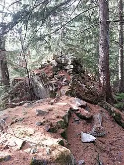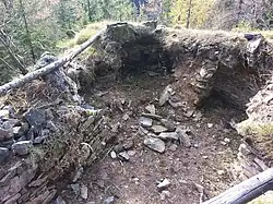 The western end of this outwork, and therefore the part furthest away from the core castle, was a southwest-facing building with a fan-shaped ground plan dating from around the 15th century. It is sometimes interpreted in the literature as a defensive tower or bastion and of which only the foundation walls remain.[3] This building was uncovered in 1993 as part of an excavation, during which the masonry was also partially restored and secured. The wall of this building rises around 1.7 meters above the recent ground level and is rounded and slightly curved inwards at the widest part of the building in the southwest, which is around 4 meters wide. This wall is the only known rounded wall in the entire castle complex. The two other building walls branch off from this arched wall and converge at a boulder in the north-east, where they form the narrowest part of the building at a width of around 1 meter. The length of the interior is around 6.5 meters. The thickness of the building wall varies between 1 meter and just over 1.5 meters. The entire east wall and parts of the north wall were collapsed and were rebuilt in the 20th century. The interior of the building is divided into two irregularly shaped areas or chambers by a tongue protruding from the curved wall in the west. Both of these chambers are smaller than 2 meters. The southern chamber has a 0.53-metre-wide entrance, while the northern chamber, which is about 20 centimetres lower, has a width of 1.5 meters. During excavation work, stone slabs were found at both entrances, which were interpreted as thresholds. In the southern part of the building there is another smaller and slightly higher niche, but its masonry has been destroyed by tree roots to such an extent that it is difficult to reconstruct its original shape. As only the foundation walls of the building have survived, it is not possible to determine the original use and function of the chambers. However, they probably served as storage rooms and the building itself probably had a lookout and defensive function. Its use as a small turret or as a roundel seems possible due to the rounded shape of the building, but must be seen as pure speculation without reliable evidence due to the state of preservation of the building alone.[29]